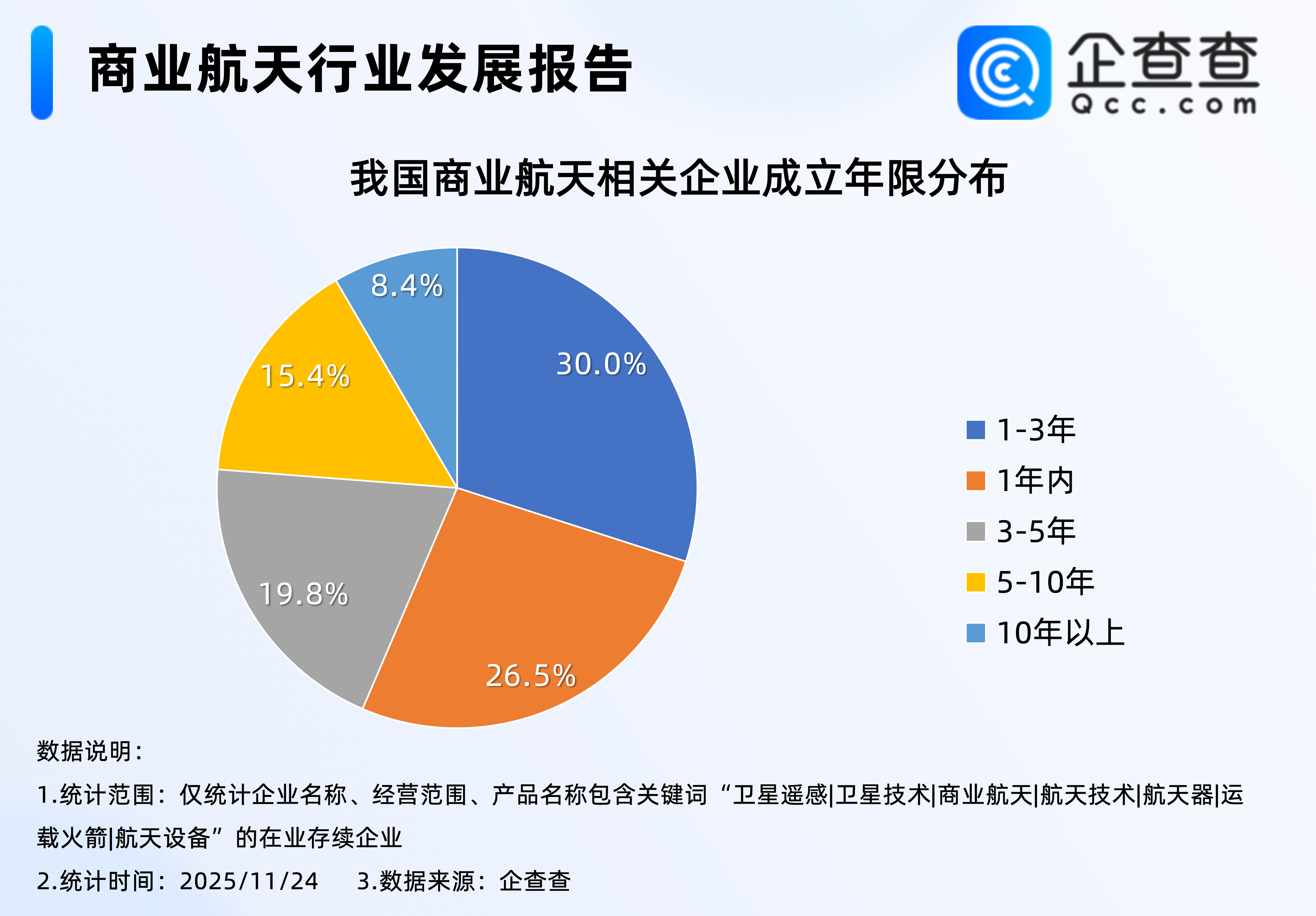 企查查数据显示,截至11月24日,我国现存超9万家商业航天相关企业,成立年限上,我国近六成商业航天相关企业成立于近三年。其中成立1至3年之间的企业占比30.0%,成立1年内的企业占比26.5%。