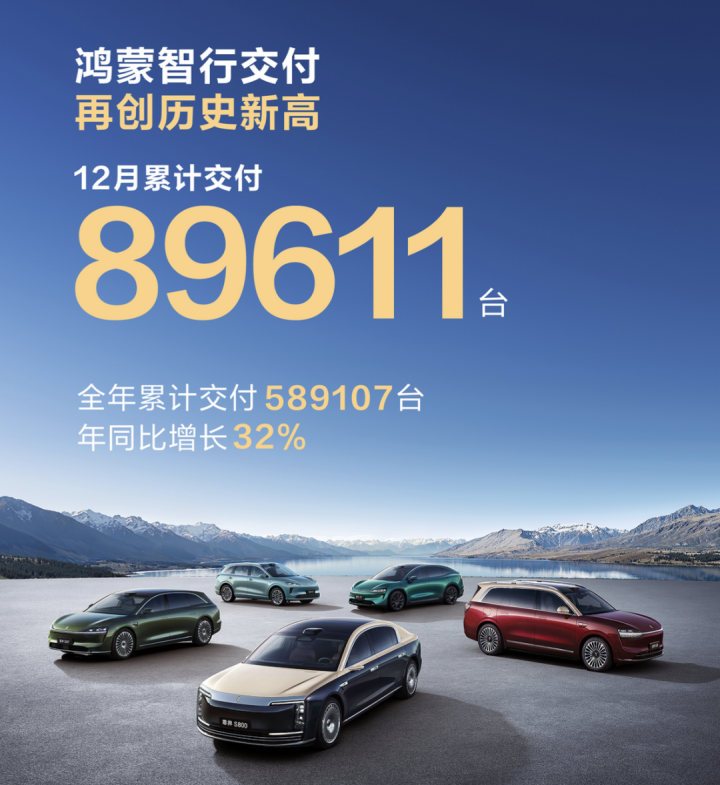 由“五界”组成的鸿蒙智行,在12月累计交付新车89611辆,创下历史新高。2025年,鸿蒙智行累计销量达到58.9万辆,同比大增32%。其中相关数据显示,问界2025年新增车主超过42万名,问界M9、问界M8、问界M7、问界M5年度交付新车分别超过11万辆、15万辆、11万辆、3万辆。